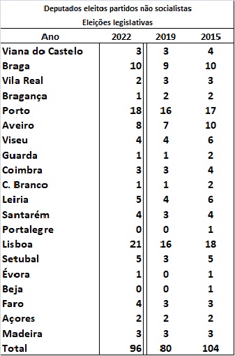 - Se, conforme cada círculo eleitoral, é possível eleger 1 deputado por cada conjunto de entre 19 e 22 mil votantes, o quadro diz-nos que o espaço dos partidos poderia ter elegido mais 5 deputados: Viseu, Coimbra, Portalegre, Beja e Aveiro. Em Lisboa, como sabemos, os 19,5 mil votos do CDS não foram suficientes;